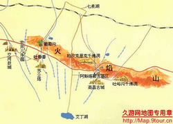 出七泉湖镇沿七芒公路南行,周围是寸草不生的茫茫戈壁,远望光秃秃蜿 蜓起伏的红色火焰山坐落其间,大约行走10多公路就进入了狭长的火焰山