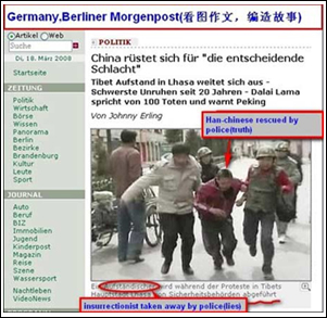 抗议者说成是“发生在西藏的新事件”;BBC给出的图片说明写道:“在拉萨有很多军队”,似乎完全没有看到救护车上大大的“急救”二字;《柏林晨报》网站将一张西藏公安武警解救被袭汉族人的照片硬说成是在抓捕藏人。