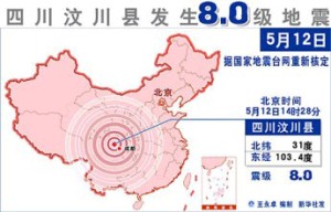 十二年后,2008年5月12日14时28分04.0秒在四川汶川县(北纬31度,东经103.4度)发生的地震震级为8.0级。包括震中50km范围内的县城和200km范围内的大中城市,北京、上海、天津、宁夏、甘肃、青海、陕西、山西、山东、河北、河南、安徽、湖北、湖南、重庆、贵州、云南、内蒙