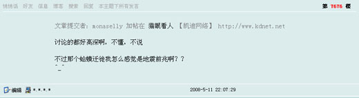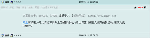 在凯迪社区猫眼看人论坛有一篇《中国历史上神秘的政治谶言》的贴子,网友们在这里大谈对推背图等一些谶言的看法及一些历史曾经应验谶言的事例。可以说这个贴子里各色人等都有,有对国内局势预测的、有对台湾马英九能否当上总统及命运预测的,有大力宣扬“宗教”的,2008年5月11日晚发生了一件十分巧合的事,网友zm001p在跟帖中说