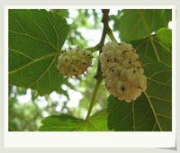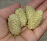 不知不觉中,车已经停在平坦的山地上。陡峭的山谷中、山地葡萄园边也到处都种植着桑树。有的已是老态龙钟,历尽百年沧桑,仍然鹤发童颜,有的风华正茂,婀娜多姿。这里的桑树叶子要比南方用于养蚕的桑叶小得多,不足南方的 三分之一,应该是十分古老的树种。桑葚大多也是白色的,偶尔才能发现很少的紫色的桑葚。恰当夏初时节。翠绿的树上结满白白胖胖的桑葚,微风吹拂,像翩翩起舞的飞蝶如趴在绿叶上取食的春蚕,煞是可爱。我们纷纷冲出车外,奔到树下,采摘起桑葚,熟透了的白桑葚玲珑剔透,白如脂玉,散发出甘美的芳香。含在嘴里,绵若膏脂,甜若蜜浆,润若花露。