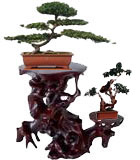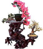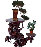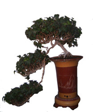 这是用常春藤作的悬崖式盆景。说来有趣,大约在1996年,我逛花市,一花农有一盆毫无姿色的常春藤,我用2元买下。经过几年的侍弄就成了这个样子。常春藤属藤本植物,一般作为悬吊盆载,你看作成盆景更加有趣……(陋室斋主制作并摄影)