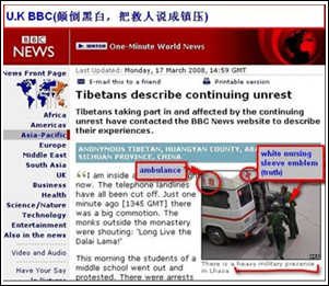 抗议者说成是“发生在西藏的新事件”;BBC给出的图片说明写道:“在拉萨有很多军队”,似乎完全没有看到救护车上大大的“急救”二字;《柏林晨报》网站将一张西藏公安武警解救被袭汉族人的照片硬说成是在抓捕藏人。