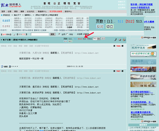 在凯迪社区猫眼看人论坛有一篇《中国历史上神秘的政治谶言》的贴子,网友们在这里大谈对推背图等一些谶言的看法及一些历史曾经应验谶言的事例。可以说这个贴子里各色人等都有,有对国内局势预测的、有对台湾马英九能否当上总统及命运预测的,有大力宣扬“宗教”的,2008年5月11日晚发生了一件十分巧合的事,网友zm001p在跟帖中说